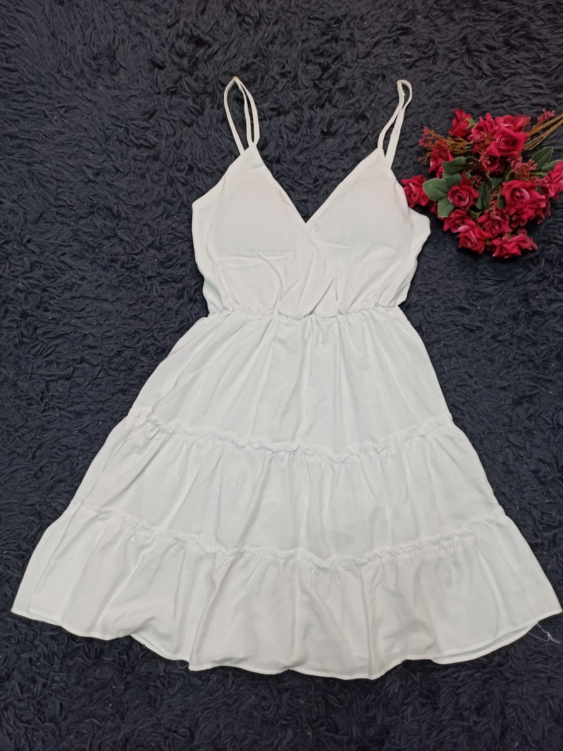 Vestido Curto Feminino em Viscose de Alça e Decote Transpassado: Um vestido delicado e sofisticado, feito de viscose, um tecido leve e fluido. Esse vestido tem alças finas e decote transpassado, que realça o busto. O comprimento é curto, na altura da coxa. Uma ótima opção para eventos mais formais, como jantares ou coquetéis.